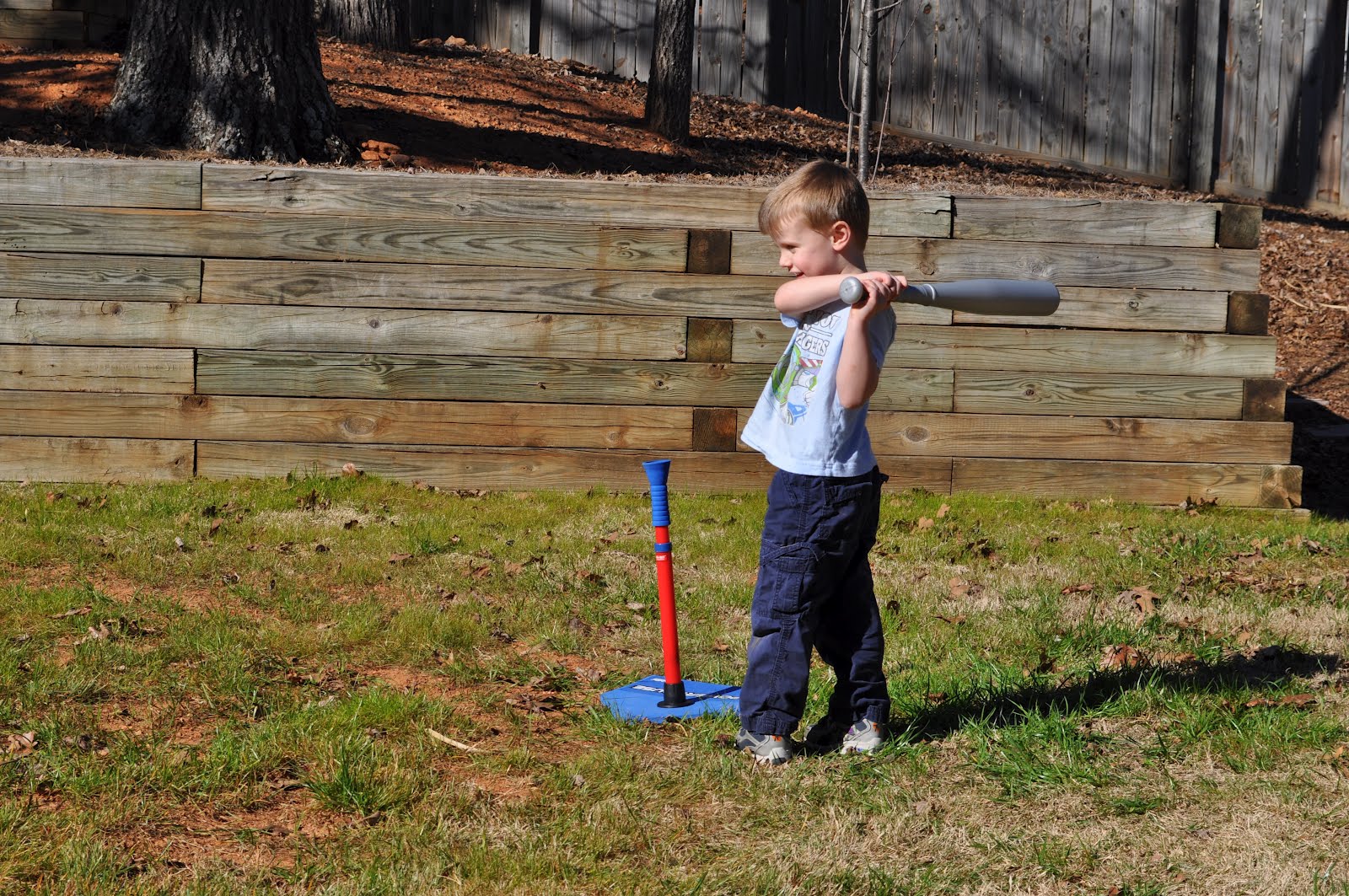 He loves to run around outside, red light/green light is a favorite of his these days. In the fall he played soccer for the first time. He enjoyed it but I think will like t-ball better. His very first practice is Saturday. Should be interesting! Brian has been practicing with him in the backyard so hopefully he will get it.