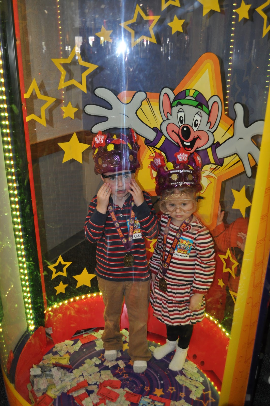 Julianna had a princess cake, of course, and Jake's was Spiderman. Chuck E Cheese puts on a little show and they sing and dance. Then it was time for Jake and Julianna to get in the ticket blaster. Every time we go they have to look at this thing. They have been wanting to grab tickets forever. Today was the day.