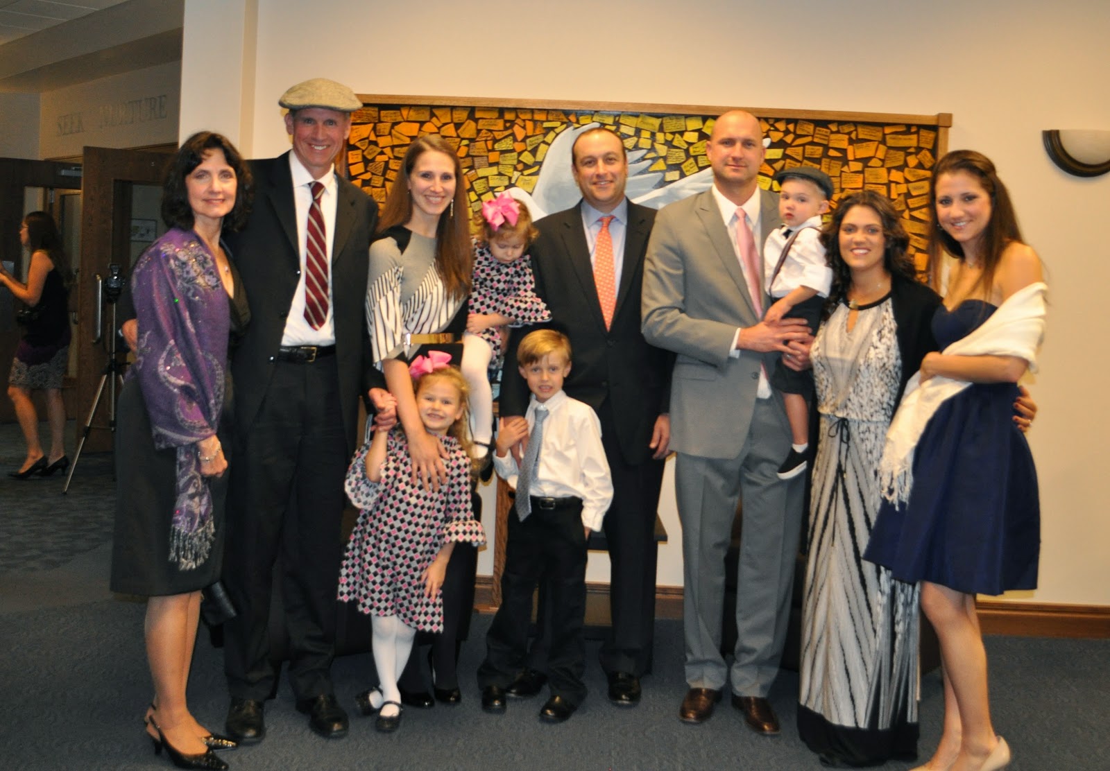 Saturday it was wedding day! Everyone was looking super cute. I was only a little nervous about the kids (I mean Grace) behaving during the wedding. She was actually pretty good. When Carissa walked down the aisle Grace said "Oooh Mommy, look it's a princess!" Julianna was very into it too. She asked all kinds of questions about who was getting married and who were the bridesmaids. Did I marry Daddy, is that how you got your rings? She was really paying attention! We made it though the wedding and just as I was breathing a sigh of relief the usher signals our aisle to leave. And Grace dumps my purse and everything in it on the floor. Awesome! Lipstick was rolling under the pews, I grabbed what I could and Brian went back for the rest. You just have to laugh.